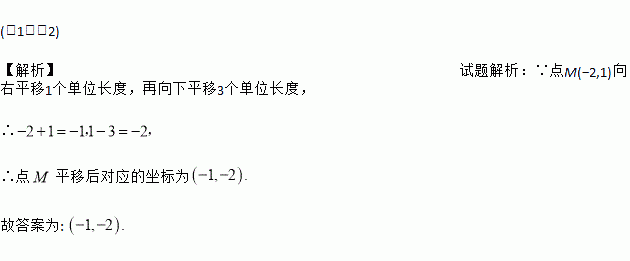 在平面直角坐标系中,点M(-2,1)先向右平移1个单位长度,再向下平移3个单位长度后的坐标是 .