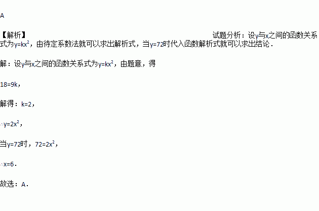 某种正方形合金板材的成本y(元)与它的面积成正比,设边长为xcm.当x=3时,y=18,那么当成本为72元时,边长为( )