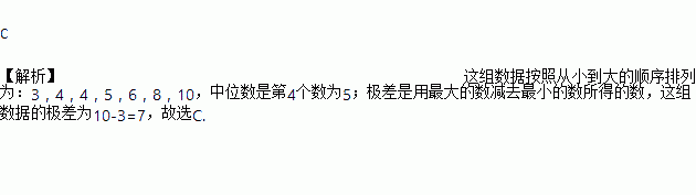 某班体育委员记录了第一小组七位同学定点投篮(每人投10次)的情况,投进篮筐的个数为6,10,5,3,4,8,4,这组数据的中位数和极差分别是 ( ).