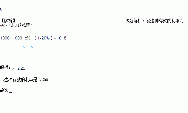 某人将1 000元人民币按一年期存入银行,一年后本金和利息共获1 018元,利息已扣除20%利息税,则这种存款的利率是( )