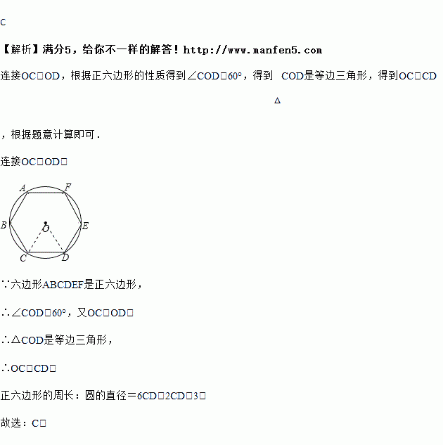来求得较为精确的圆周率.祖冲之在刘徽的基础上继续努力,当正多边形的边数增加24576时,得到了精确到小数点后七位的圆周率,这一成就在当时是领先其他国家一千多年,如图,依据“割圆术”,由圆内接正六边形算得的圆周率的近似值是( )