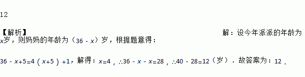 12 【解析】【解析】 设今年派派的年龄为x岁,则妈妈的年龄为(36﹣x)岁,根据题意得: 36﹣x+5=4(x+5)+1,解得:x=4,∴36﹣x﹣x=28,∴40﹣28=12(岁).故答案为:12.