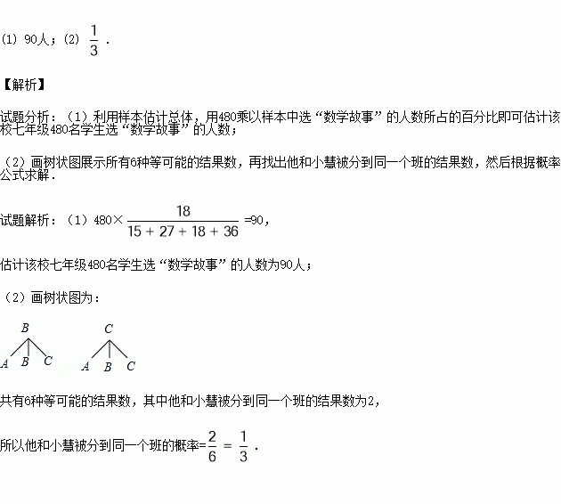 (2)学校将选“数学故事”的学生分成人数相等的A,B,C三个班,小聪、小慧都选择了“数学故事”,已知小聪不在A班,求他和小慧被分到同一个班的概率.(要求列表或画树状图)