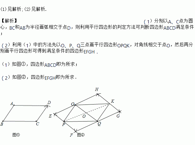(1)如图①,点A、B、C是平行四边形ABCD的三个顶点,求作平行四边形ABCD;