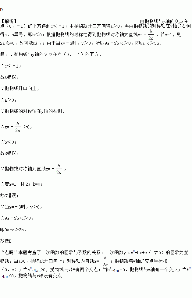 D 【解析】由抛物线与y轴的交点在点(0,﹣1)的下方得到c<﹣1;由抛物线开口方向得a>0,再由抛物线的对称轴在y轴的右侧得a、b异号,即b<0;根据抛物线的对称性得到抛物线对称轴为直线x=﹣,若x=1,则2a+b=0,故可能成立;由于当x=﹣3时,y>0,所以9a﹣3b+c>0,即9a+c>3b. 【解析】 ∵抛物线与y轴的交点在点(0,﹣1)的下方. ∴c<﹣1; ...