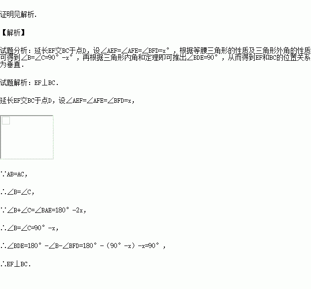已知:如图所示,△ABC中,AB=AC,点E在CA的延长线上,且∠AEF=AFE,求证:EF⊥BC。