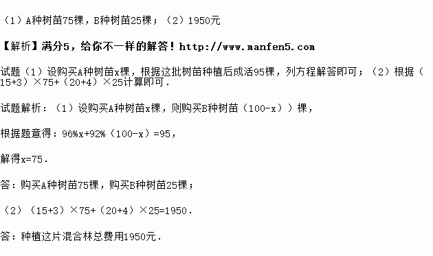 生态公园计划在园内的坡地上种植一片有A、B两种树的混合林,需要购买这两种树苗共100棵.假设这批树苗种植后成活95棵,种植A、B两种树苗的相关信息如下表: