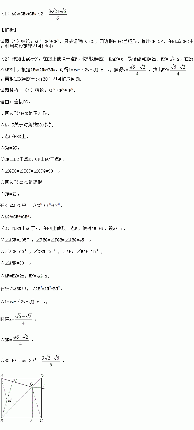 (2)若正方形ABCD的边长为1,∠AGF=105°,求线段BG的长.