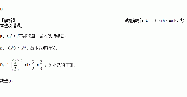 A. ﹣(﹣a+b)=a+b B. 3a3﹣3a2=a C. (x6)2=x8 D. 1÷()﹣1=
