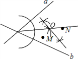 a,b分别代表铁路和公路,点M、N分别代表蔬菜和杂货批发市场.现要建中转站O点,使O点到铁路、公路距离相等,且到两市场距离相等.请用尺规画出O点位置,不写作法,保留痕迹.