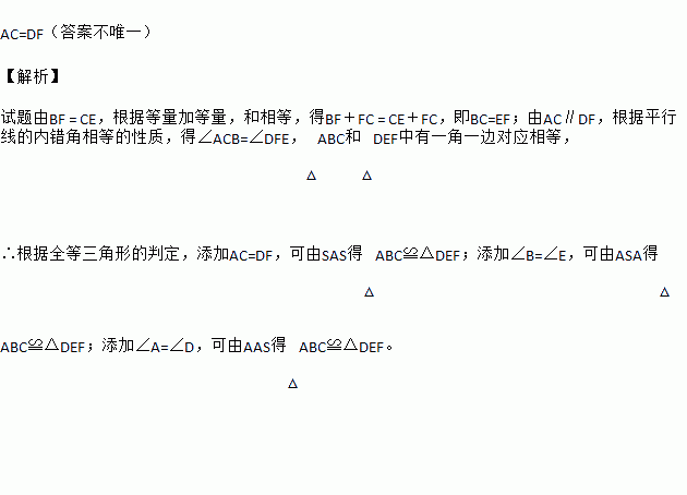 如图,在△ABC和△DEF中,点B、F、C、E在同一直线上,BF = CE,AC∥DF,请添加一个条件,使△ABC≌△DEF,这个添加的条件可以是 .(只需写一个,不添加辅助线)