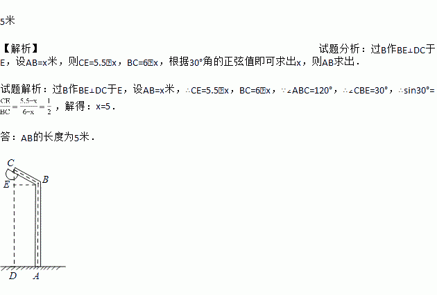 如图,用一根6米长的笔直钢管弯折成如图所示的路灯杆ABC,AB垂直于地面,线段AB与线段BC所成的角∠ABC=120°,若路灯杆顶端C到地面的距离CD=5.5米,求AB长.