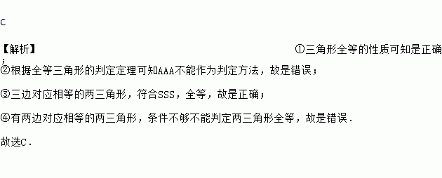 C 【解析】①三角形全等的性质可知是正确; ②根据全等三角形的判定定理可知AAA不能作为判定方法,故是错误; ③三边对应相等的两三角形,符合SSS,全等,故是正确; ④有两边对应相等的两三角形,条件不够不能判定两三角形全等,故是错误. 故选C.
