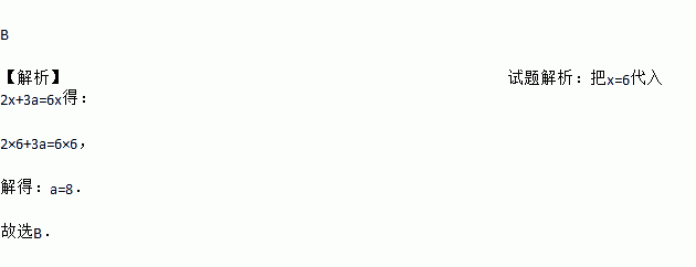 B 【解析】试题解析:把x=6代入2x+3a=6x得: 2×6+3a=6×6, 解得:a=8. 故选B.