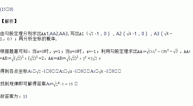 如图,直线y=x+1分别与x轴、y轴相交于点A、B,以点A为圆心、AB长为半径画弧交x轴于点A1,再过点A1作x轴的垂线交直线于点B1,以点A为圆心、AB1长为半径画弧交x轴于点A2……按此做法进行下去,则点A8的坐标是________.