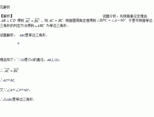 如图,已知CD是⊙O的直径,弦AB⊥CD,垂足为点M,点P是弧AB上一点,且∠BPC=60°.试判断△ABC的形状,并说明你的理由.