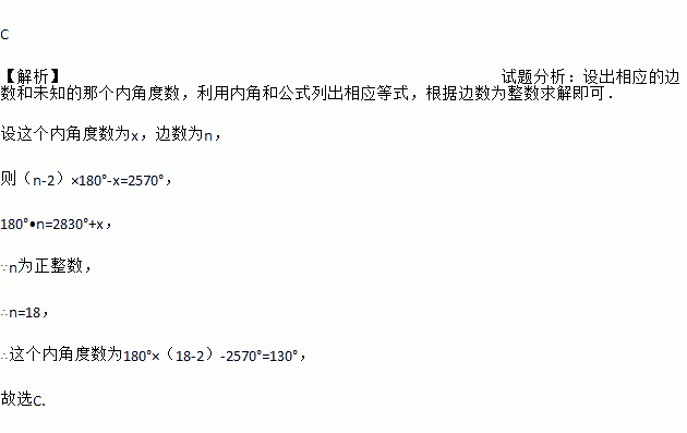 C 【解析】试题分析:设出相应的边数和未知的那个内角度数,利用内角和公式列出相应等式,根据边数为整数求解即可. 设这个内角度数为x,边数为n, 则(n-2)×180°-x=2570°, 180°•n=2830°+x, ∵n为正整数, ∴n=18, ∴这个内角度数为180°×(18-2)-2570°=130°, 故选C.