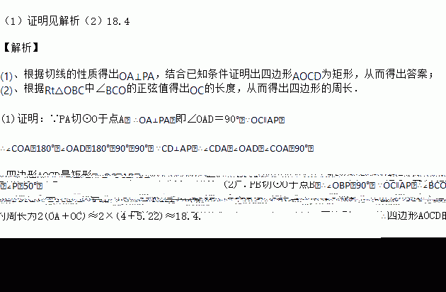 (2)若∠P=50°,⊙O的半径为4,求四边形AOCD的周长(精确到0.1,参考数据:sin50°≈0.766,cos50°≈0.643,tan50°≈1.192).
