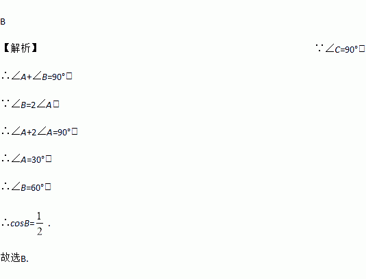 在Rt△ABC中,∠C=900,∠B=2∠A,则cosB等于( )