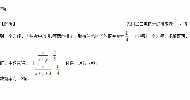 在围棋盒中有x颗白色棋子和y颗黑色棋子,从盒中随机取出一颗棋子,取得白色棋子的概率是,如再往盒中放进3颗黑色棋子,取得白色棋子的概率变为,则原来盒里有白色棋子_____颗.