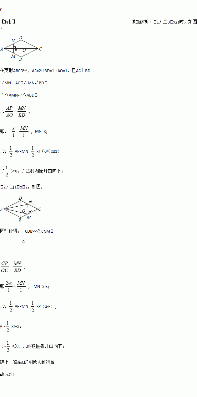 如图所示,P是菱形ABCD的对角线AC上一动点,过P垂直于AC的直线交菱形ABCD的边于M、N两点,设AC=2,BD=1,AP=x,△AMN的面积为y,则y关于x的函数图象的大致形状是( )