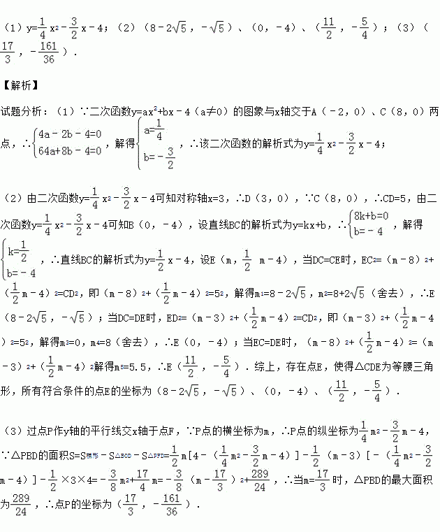 如图,在平面直角坐标系xOy中,二次函数y=ax2+bx﹣4(a≠0)的图象与x轴交于A(﹣2,0)、C(8,0)两点,与y轴交于点B,其对称轴与x轴交于点D.