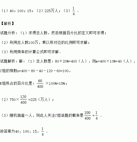 (2)合肥市人口现有750万人,请你估计其中关注D组话题的市民人数;
