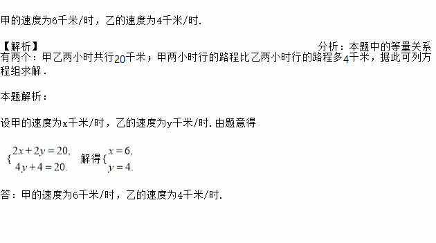 A、B两地相距20千米,甲从A地向B地匀速行进,同时乙从B地向A地匀速行进,两个小时后两人在途中相遇,相遇后甲立即以原速返回A地,乙继续以原速向A地行进,甲回到A地时乙离A地还有4千米,求甲、乙两人的速度.
