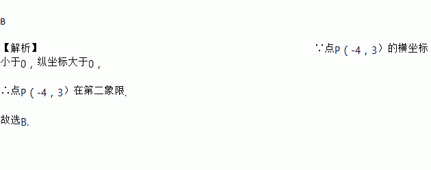 B 【解析】∵点P(-4,3)的横坐标小于0,纵坐标大于0, ∴点P(-4,3)在第二象限. 故选B.