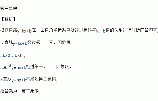 在平面直角坐标系中,若直线y=kx+b经过第一、三、四象限,则直线y=bx+k不经过的象限是________.
