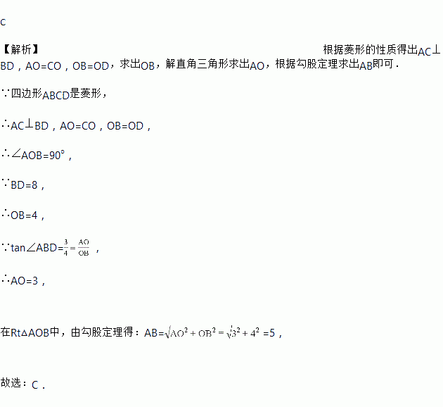 如图,在菱形ABCD中,对角线AC、BD相交于点O,BD=8,tan∠ABD=,则线段AB的长为( )