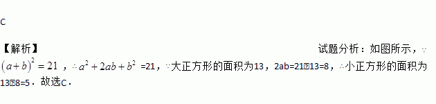 C 【解析】试题分析:如图所示,∵,∴=21,∵大正方形的面积为13,2ab=21﹣13=8,∴小正方形的面积为13﹣8=5.故选C.