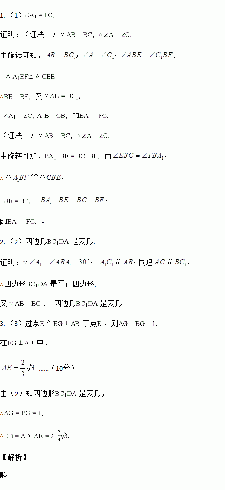 在△ABC中,AB=BC=2,∠ABC=120°,将△ABC绕着点B顺时针旋转角a(0°<a<90°)得到△A1BC;A1B交AC于点E,A1C1分别交AC、BC于D、F两点.