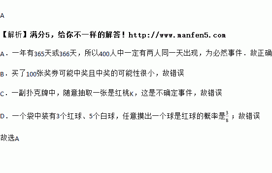D. 一个袋中装有3个红球、5个白球,任意摸出一个球是红球的概率是![]()