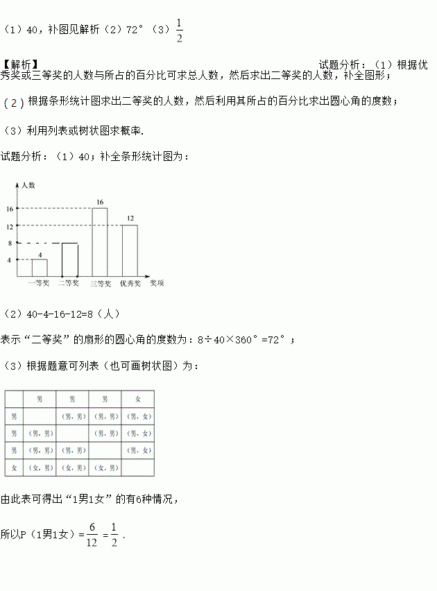 (3)获得一等奖的4名学生中有3男1女,现打算从中随机选出2名学生参加颁奖活动,请用列表或画树状图的方法求选出的2名学生恰好是1男1女的概率﹒