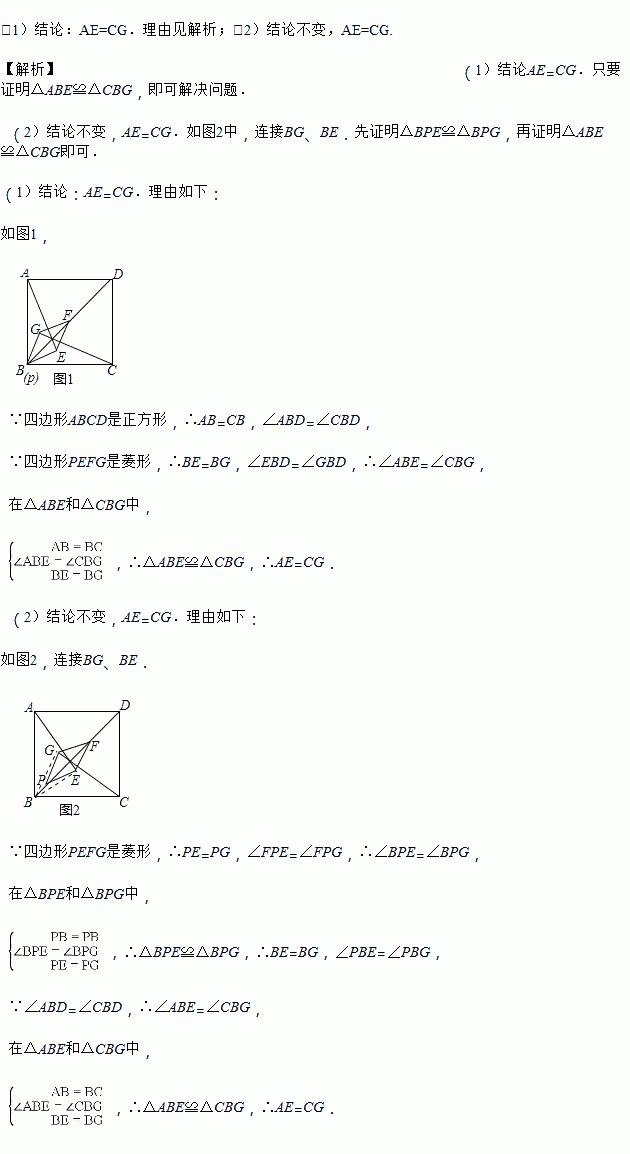 (2)当(1)中的菱形PEFG沿着正方形ABCD的对角线平移到如图2的位置时,猜想线段AE与CG的数量关系,只写出猜想不需证明.