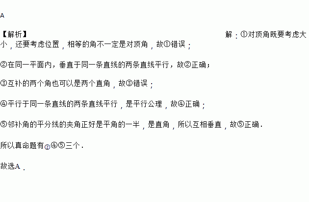 已知下列命题:①相等的角是对顶角;②在同一平面内,垂直于同一条直线的两条直线平行;③互补的两个角一定是一个锐角,另一个为钝角;④在同一平面内,平行于同一条直线的两条直线平行;⑤邻补角的平分线互相垂直.其中真命题的个数为( )