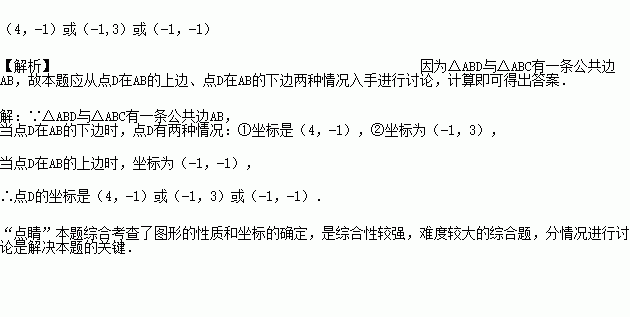如图,△ABC中,点A的坐标为(0,1),点C的坐标为(4,3)如果要使以点A、B、D为顶点的三角形与△ABC全等,那么点D的坐标是_____________.