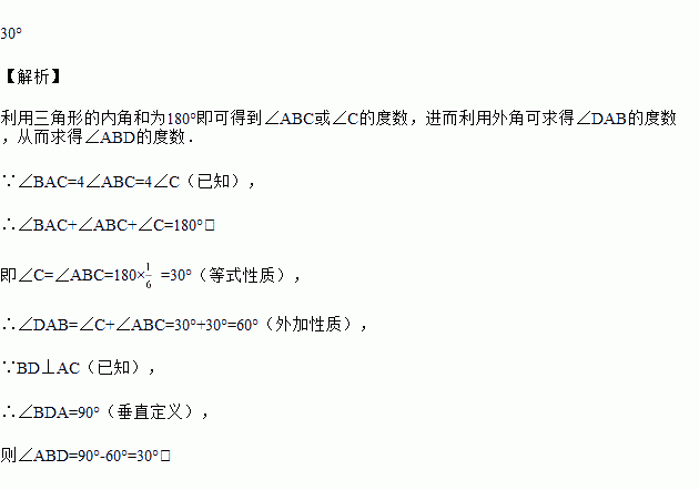 如图所示,在ΔABC中,∠BAC=4∠ABC=4∠C,BD⊥AC,垂足为D,求∠ABD的度数.