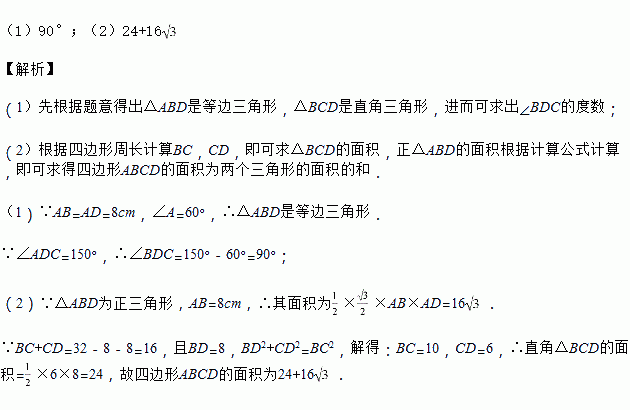 如图,在四边形ABCD中,AB=AD=8,∠A=60°,∠ADC=150°,四边形ABCD的周长为32.
