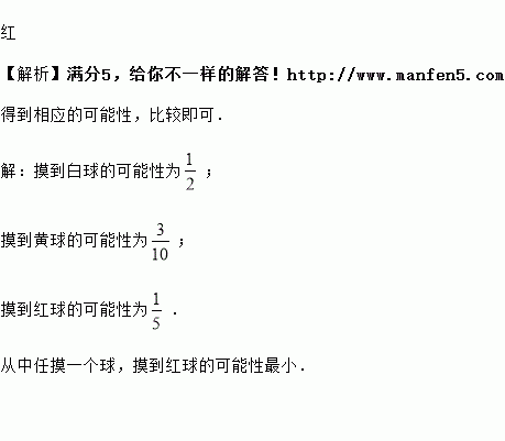 一个袋中装有10个大小相同的球,其中有5个白球,3个黄球,2个红球,从中任摸一个球,摸到 球的可能性最小.