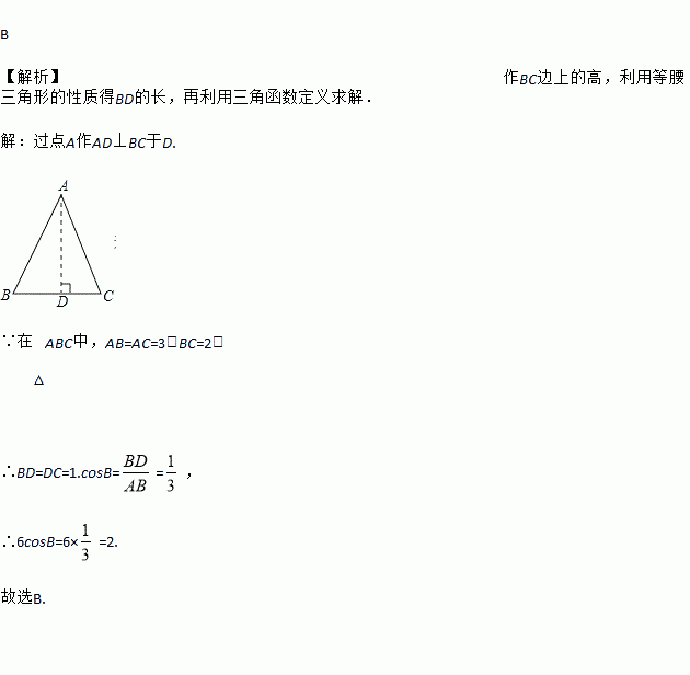 在△ABC中,AB=AC=3,BC=2,则6cosB等于 ( )