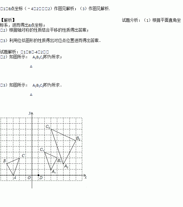 (3)在网格内,以图中的点D为位似中心,将△A1B1C1作位似变换且把边长放大到原来的两倍,得到△A2B2C2.