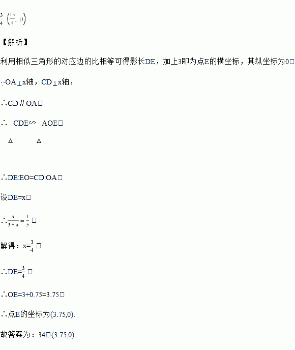 直角坐标系内,一点光源位于A(0,5)处,线段CD⊥x轴,垂足为D,C点坐标为(3,1).则CD在x轴上的影长为________,点C的影子B的坐标为__________.