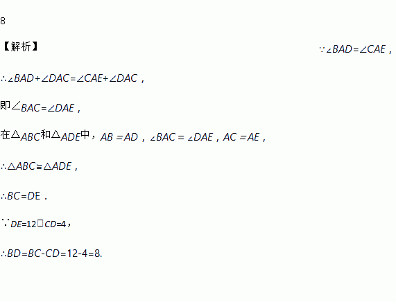 如图,在△ABC中,点D在BC上且AB=AD,AC=AE,∠BAD=∠CAE,DE=12,CD=4,则BD=_________.