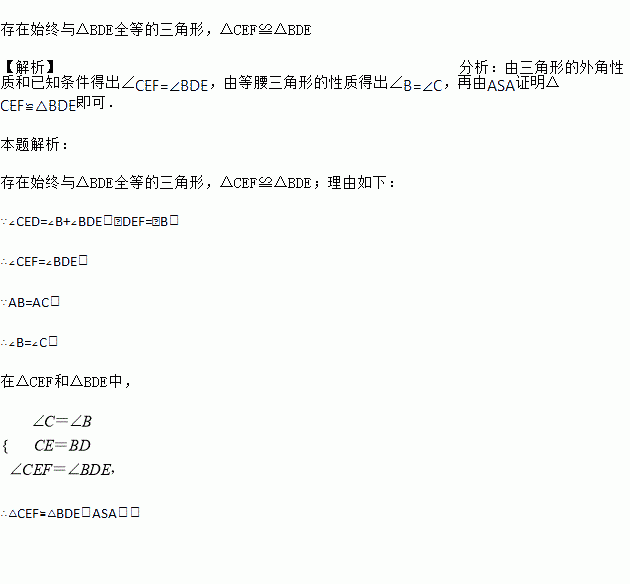 已知,如图,△ABC中,AB=AC,动点D、E、F在AB、BC、AC上移动,移动过程中始终保持BD=CE,∠DEF=∠B,请你分析是否存在始终与△BDE全等的三角形,并说明理由。