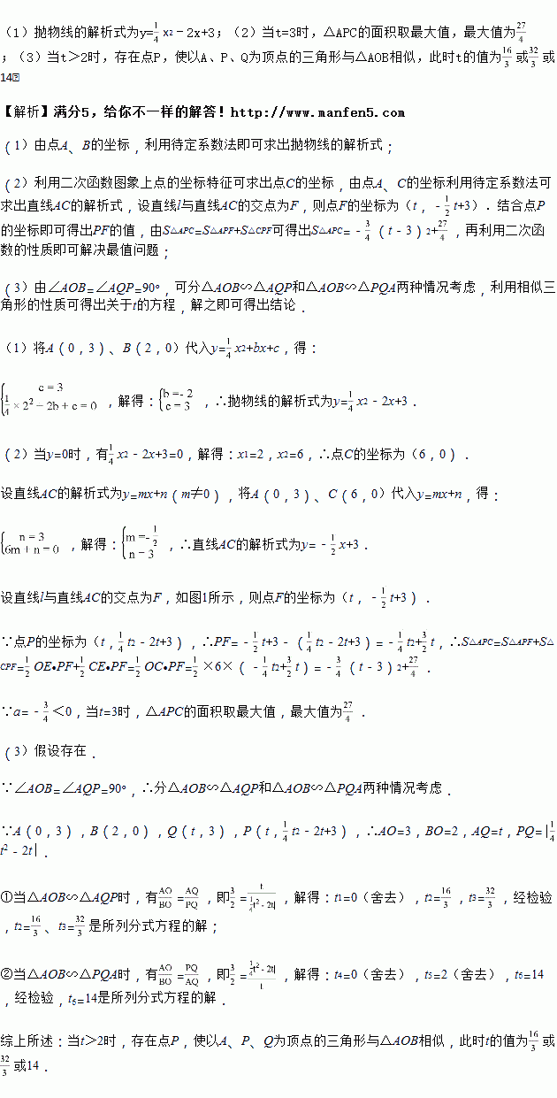 x2+bx+c与y轴的交于点A(0,3),与x轴的交于点B和C,点B的横坐标为2.点A关于抛物线对称轴对称的点为点D,在x轴上有一动点E(t,0),过点E作平行于y轴的直线与抛物线、直线AD的交点分别为P、Q.