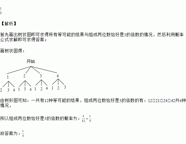 四个数中随机取两个数,第一个作为十位数字,第二个作为个位数字,组成一个两位数,则这个两位数是![]()