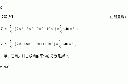 C 【解析】由题意得: 甲=; 乙=. ∴甲、乙两人射击成绩的平均数分别是8和8. 故选C.