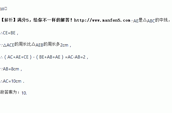 如图,已知AE是△ABC的边BC上的中线,若AB=8cm,△ACE的周长比△AEB的周长多2cm,则AC=_____cm.